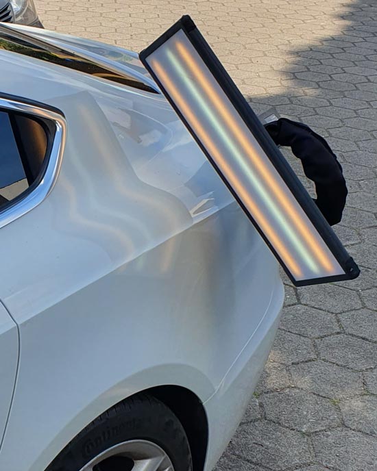 - Für die Begutachtung des Schadensausmaßes nutzen Experten Instrumente wie einen Dellenreflektor.